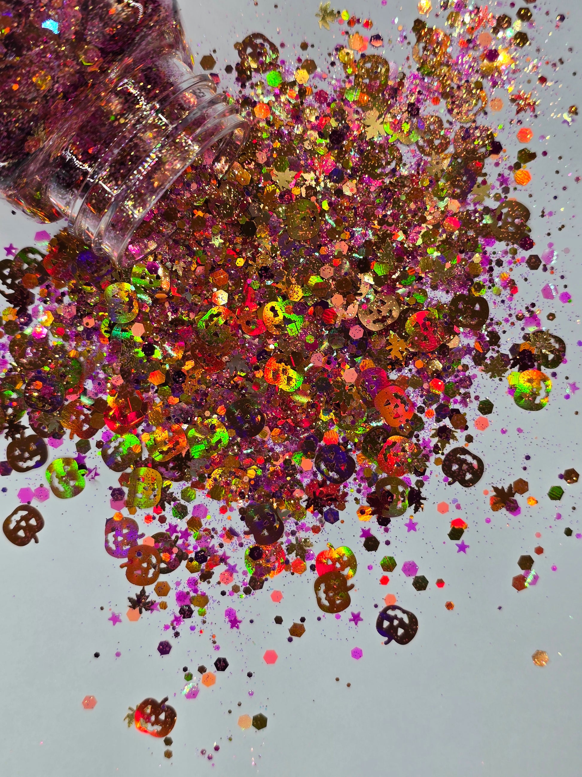 A dazzling autumn mix of shimmering pumpkins, fiery leaves, and pops of bright pink, ready to sprinkle cozy fall vibes on everything you touch.