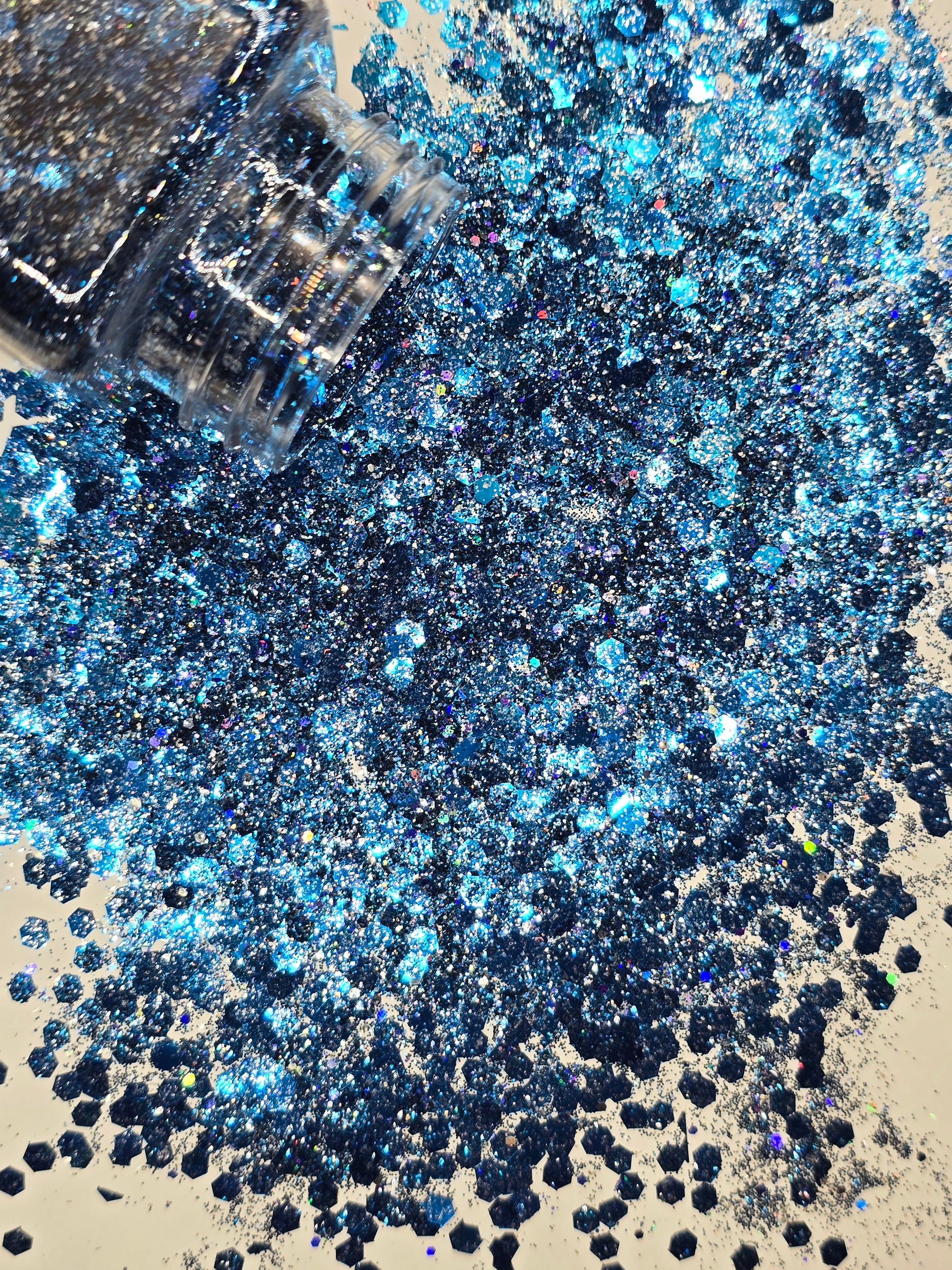 Rich midnight blues with a sparkling glow, like a warm summer night under the stars.