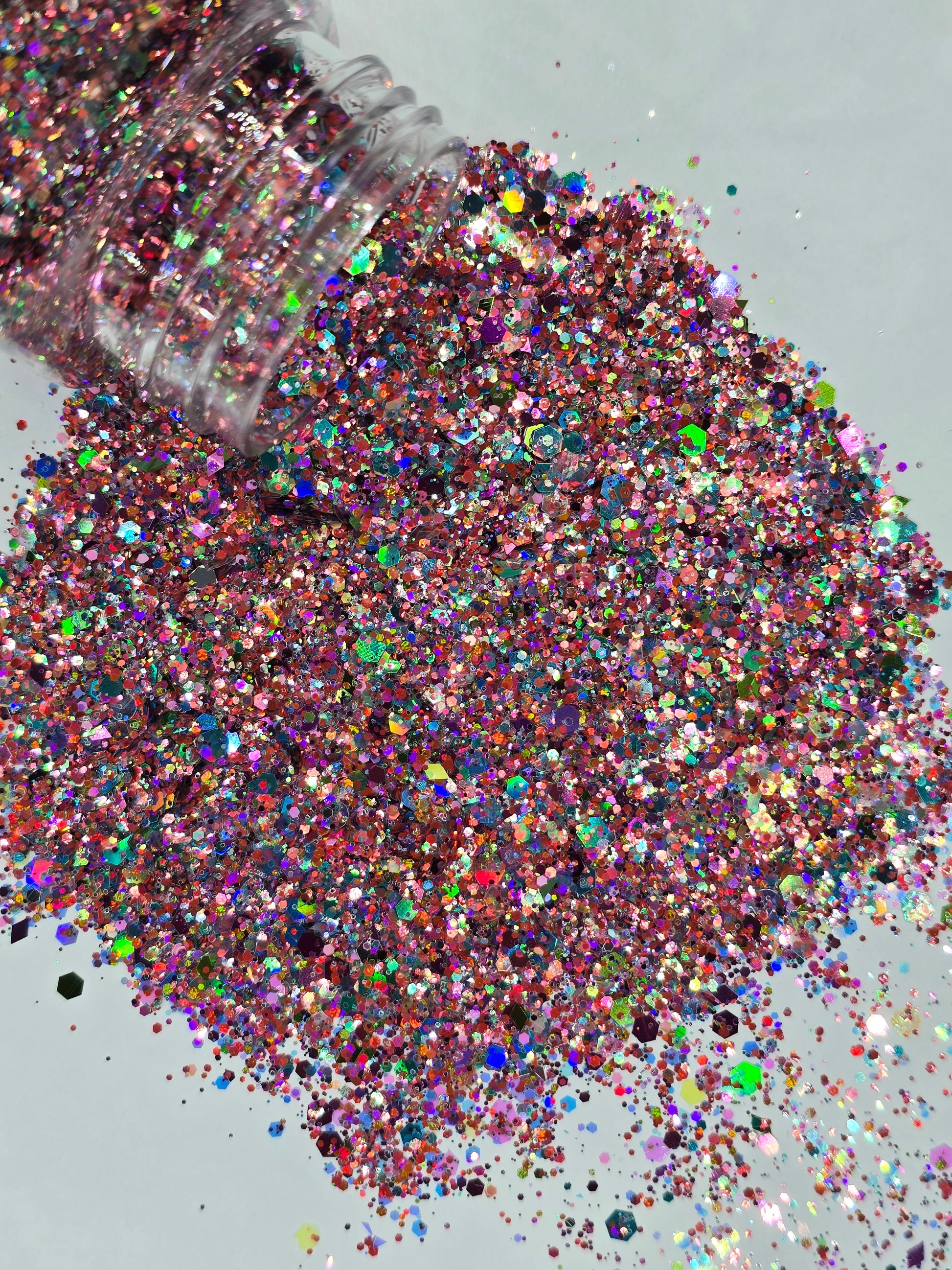 Bright, juicy colors with a sparkling twist — like a tropical sunset turned into glitter.